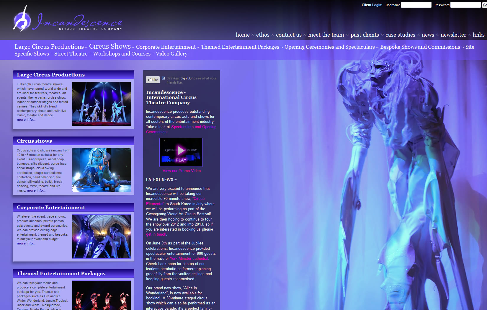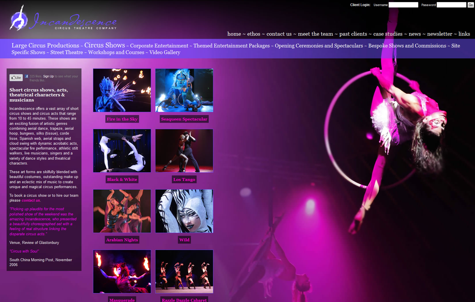 Company: Incandescence What they wanted to achieve: They wanted many things :) Firstly to be "branded" and secondly to have a website that would be both dazzling and more optimised for search engines. What we did: Working very closely with the client we created a fresh new identity that could tie together all their communications materials, together with a new website that they could update from a high wire in Hong Kong if necessary. How we did it: We chose an element from one of their performances to be the key brand identity, the hooped acrobat, and combined this with the use of rich backgrounds and a distinctive style. We worked extremely closely on every element with the client as the website had to represent their own style and performances. The website itself is a clever mix of bespoke database driven content and imagery that can be updated via the internet. How they maintain it: Customer own maintenance What they think of it: They specifically have said they want to write this... we are still waiting Satya, get off those high hoops and tap something out. Website: www.incandescence.co.uk Screenshots